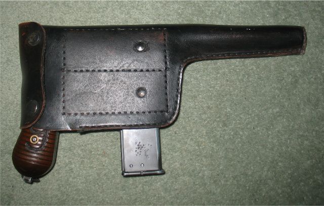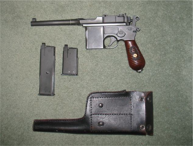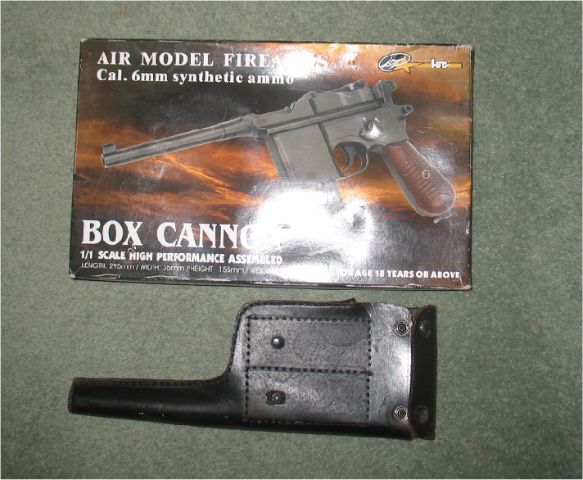 HFC Box cannon. Very little use. Has been 'aged' by rubbing exposed edges to reveal the metal underneath. Figure '9' has been added to pistol grip to denote 9mm and I have to admit a rather poor trade of 'MauseR' has been added to frame. Complete with two mags. Long one is good, short one leaked from the day I got it and I have not been able to fix it. Also included is a chinese leather holster that has been a bit butchered.