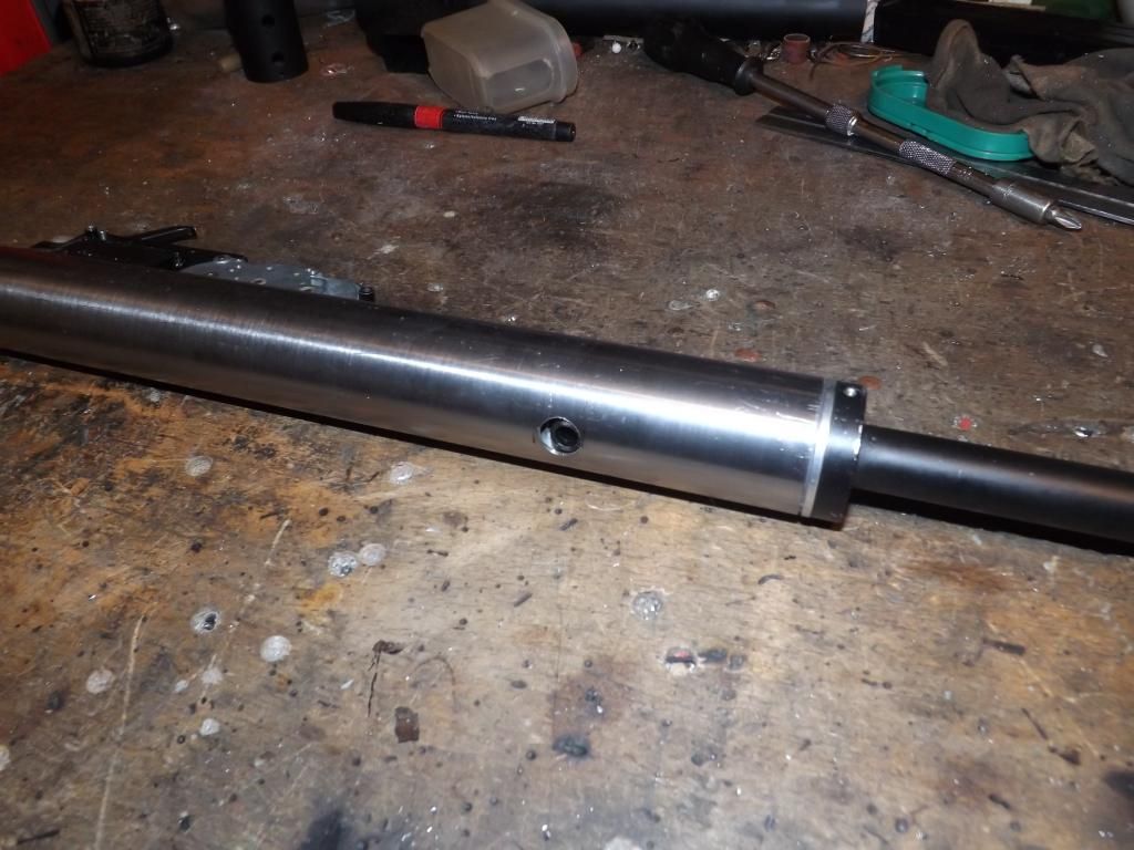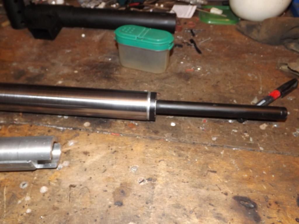didn't have loads of time today but the outer barrel is extended and threaded for the flash hider and front sight ,easy enough job as it's steel ,just tapped a thread on both the extension and the sten barrel then screwed them together supported them both in the lath to be perfectly true then ran a weld around the joint finally just skimmed over the weld and trued on the lath .the barrel now has a m14 left hand thread on it so you could fit any modern flash hider you like ![]()