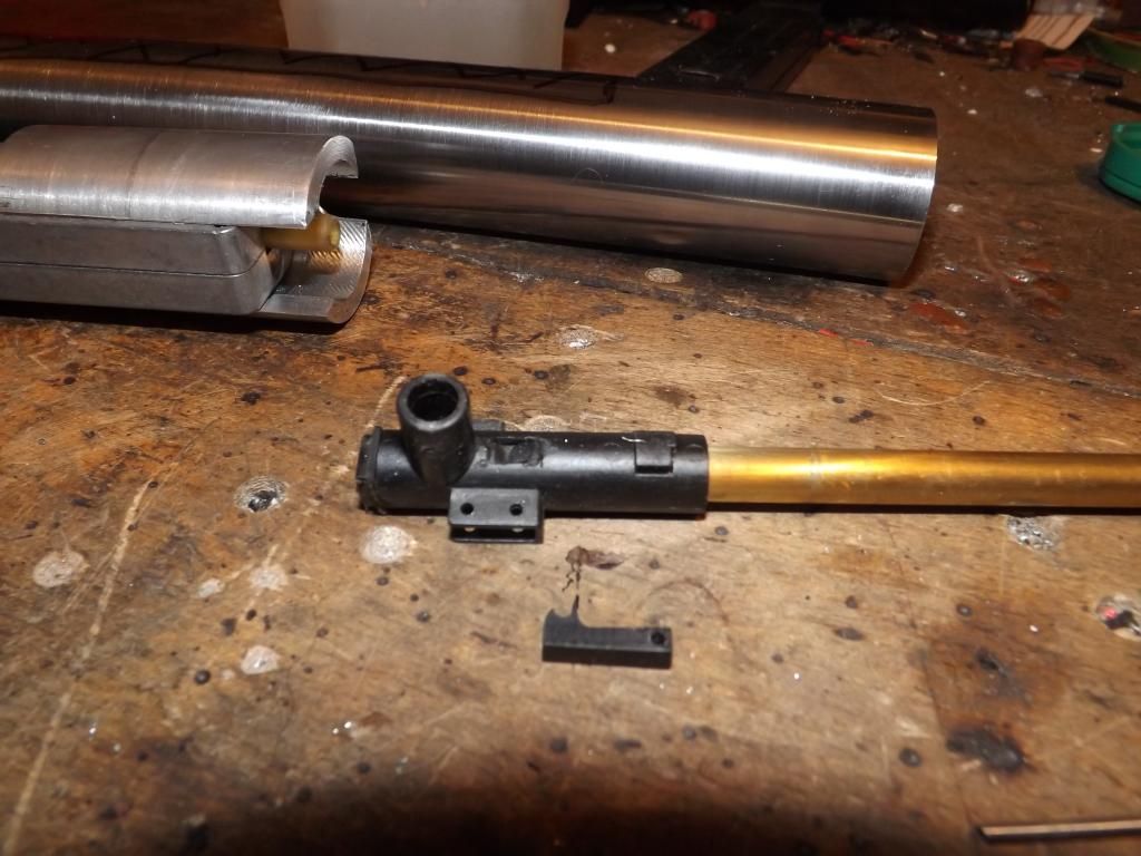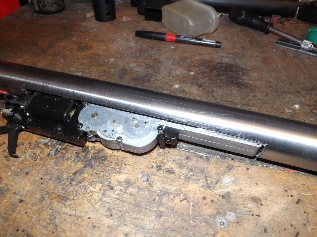 Finished for the day now ,the last thing I did was cut the bottom of the main tube for fitting the gearbox ,it all fit's nice and snug ,next thing to do will be the mag well and catch .the. Gearbox does'nt protrude very far down under the main tube ,there's the possibility of a semi skeleton trigger housing without it looking too dreadfull but we'll have to see how it goes .the magazines are going to be reversed so the feed is toward the front ,after a little testing it seem's they feed better on an angle that way around for both the king arms and arm ones ,and having the magazine inclined slightly forward is a must in my view .