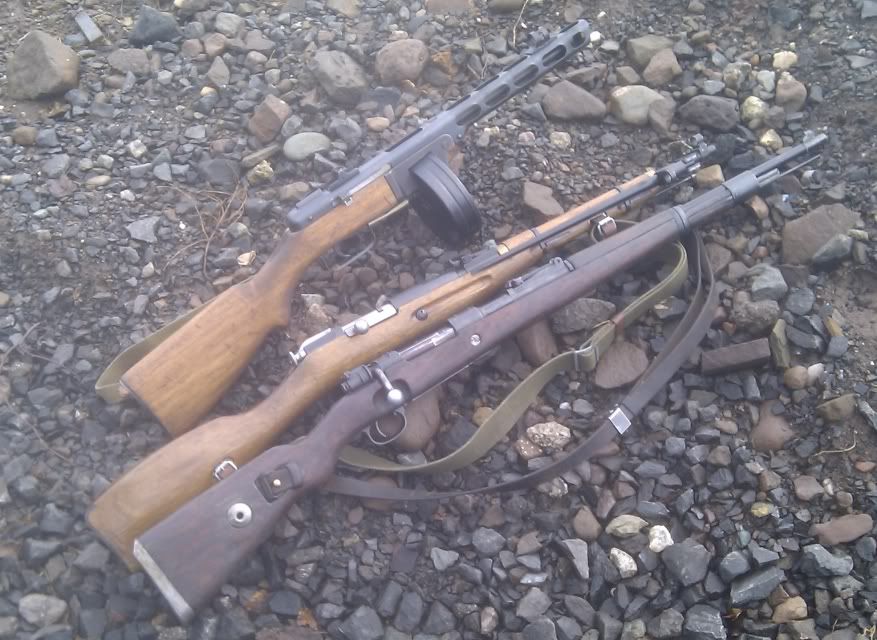 Tanaka Kar98(1942 woodwork and parts), M1 Garand AEG(1940's woodwork and metalwork), MG34, SVT40, Mosin Nagant M44, MP40, PPSH41, Luger and PPK.